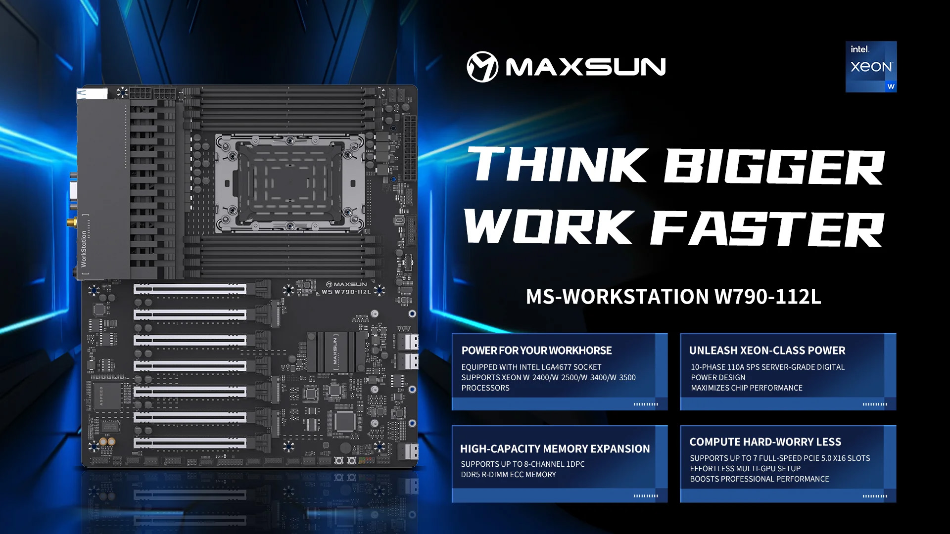 La MAXSUN Workstation W790-112L repose sur le chipset Intel W790, une plateforme dédiée aux processeurs Intel Xeon et Core haut de gamme, pensée pour les environnements professionnels nécessitant stabilité et puissance.